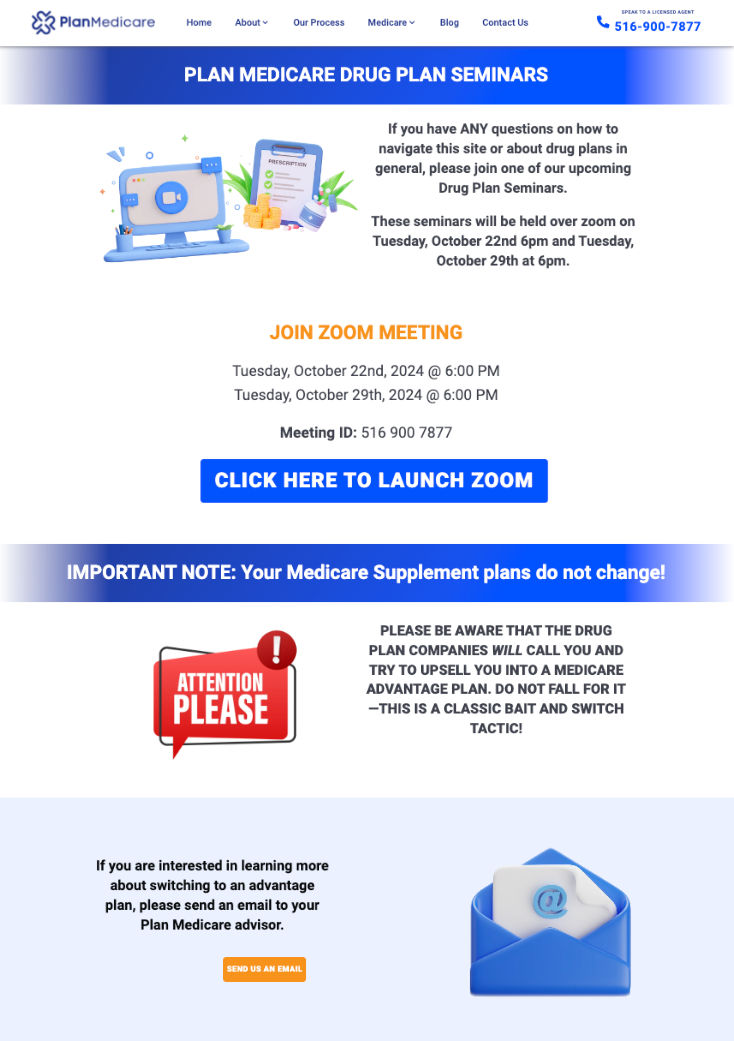 For Plan Medicare’s Annual Enrollment Period Drug Plan Review, I designed a landing page that delivered key announcements in a simple, easy-to-read format. The layout was crafted with large text and straightforward navigation, ensuring accessibility for our target demographic. This landing page, featured in an email blast, impressed the CEO and successfully supported many of Plan Medicare’s clients.